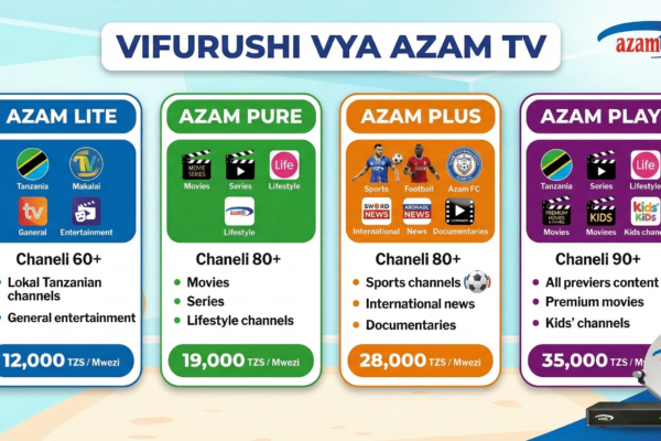 Vifurushi Vikuu vya Azam TV (DTH na DTT Tanzania) Azam Lite Bei: Takriban TZS 12,000 kwa mwezi Idadi ya chaneli: 80+ Hiki ni kifurushi cha bei nafuu zaidi, kinachofaa familia zinazotaka chaneli za msingi za habari, burudani za kienyeji na za kimataifa bila gharama kubwa. Azam Pure Bei: Takriban TZS 19,000 kwa mwezi (zamani ilikuwa…