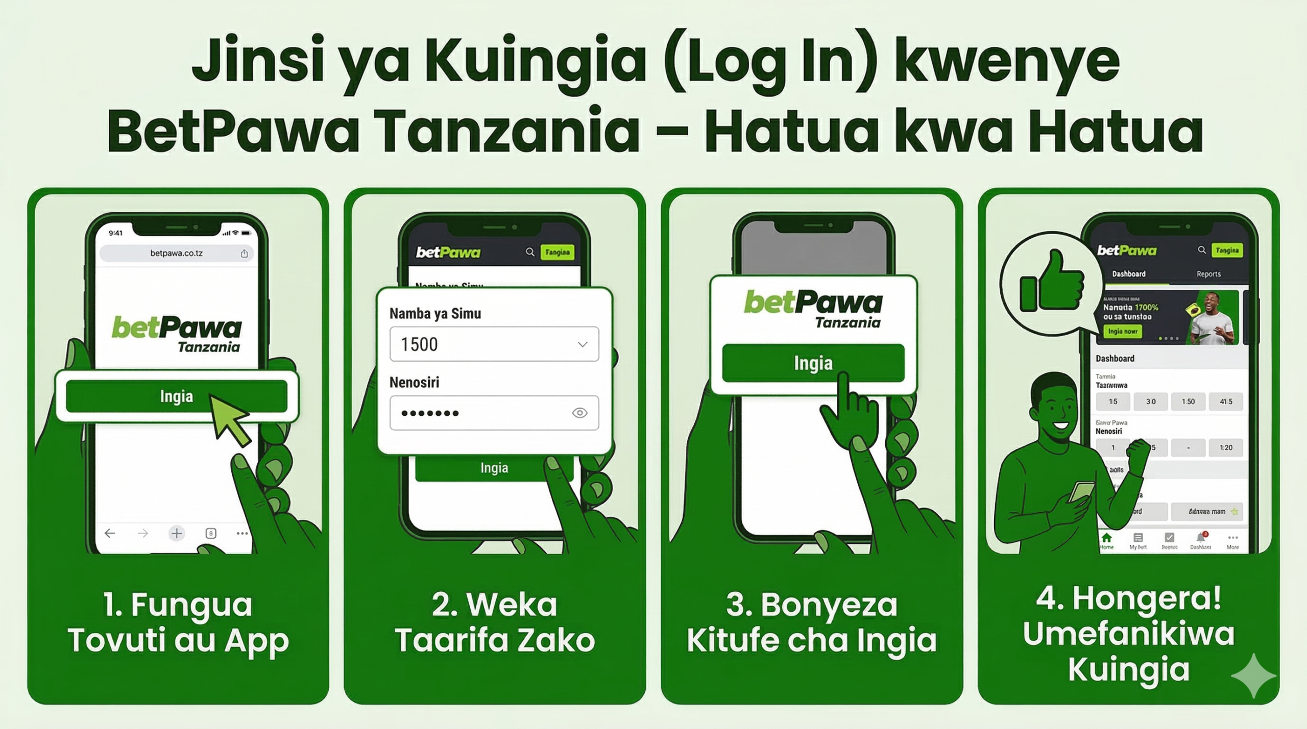BetPawa TZ inatumia namba yako ya simu na PIN ya tarakimu 4 (password) ili kuingia. Hakuna username maalum – ni rahisi na salama. Unaweza kuingia kupitia tovuti www.betpawa.co.tz au app (Android/iOS) kutoka simu yako. Minimum umri miaka 18+, na namba lazima iwe ile uliyosajili nayo.