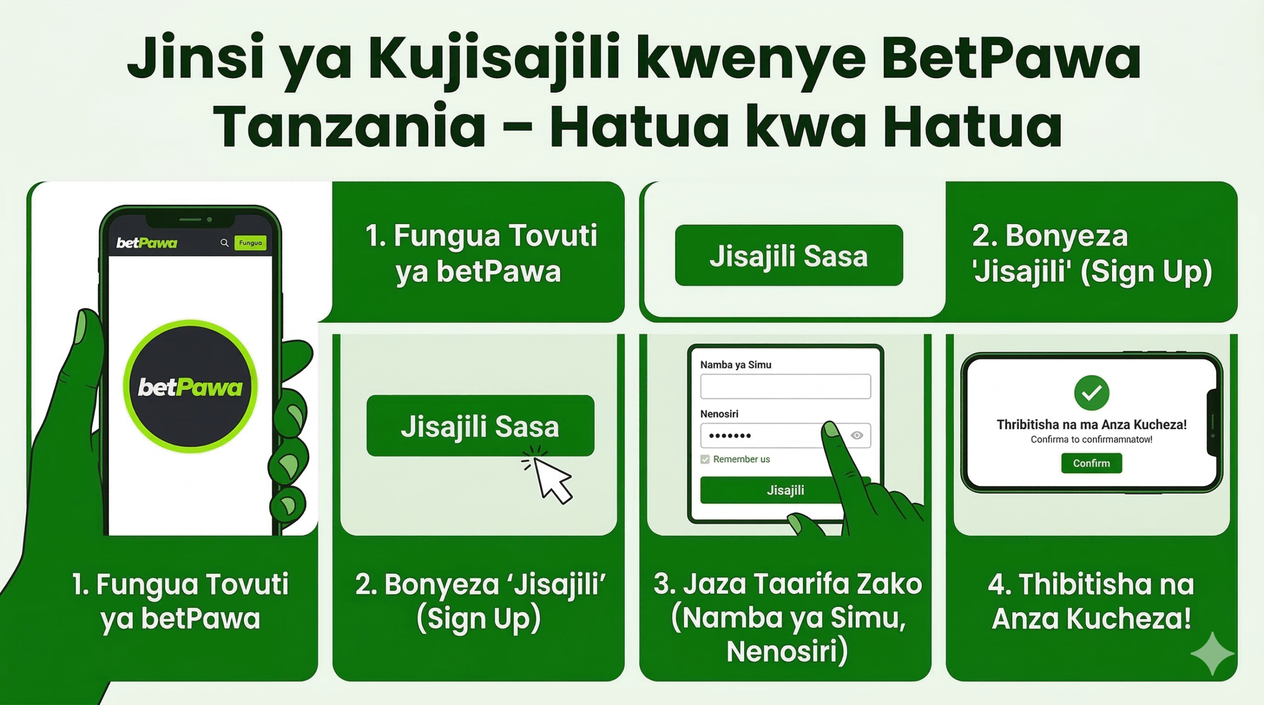 BetPawa ni moja ya majukwaa maarufu ya kubashiri michezo Tanzania – inaruhusu kubashiri kidogo (kwa TZS 100 tu) na kushinda pesa nyingi. Usajili ni rahisi sana, unaweza kukamilisha kwa sekunde chache tu kwa simu yako (Android au iPhone) au kompyuta. Unahitaji tu namba ya simu iliyo hai (Vodacom, Tigo, Airtel au Halotel) na umri wa miaka 18+ (kisheria).