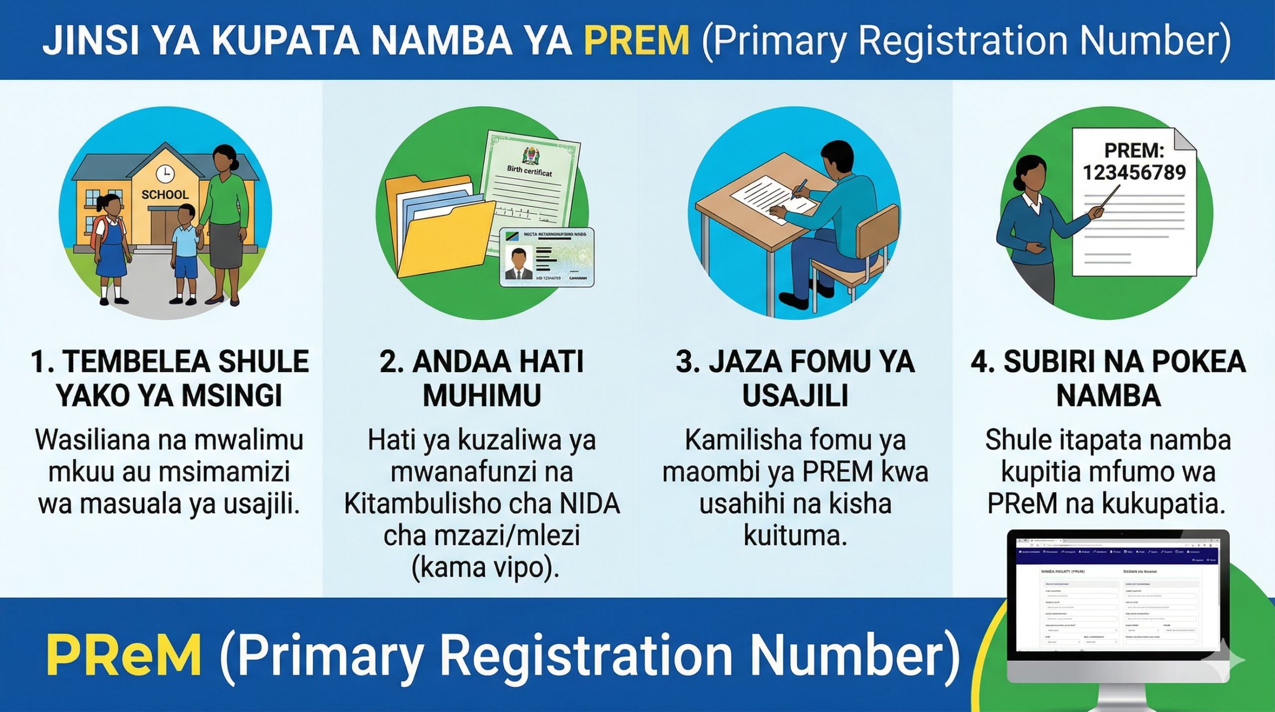 • Shule inawajibika kusajili wanafunzi wote katika mfumo wa PReM au PREMS.