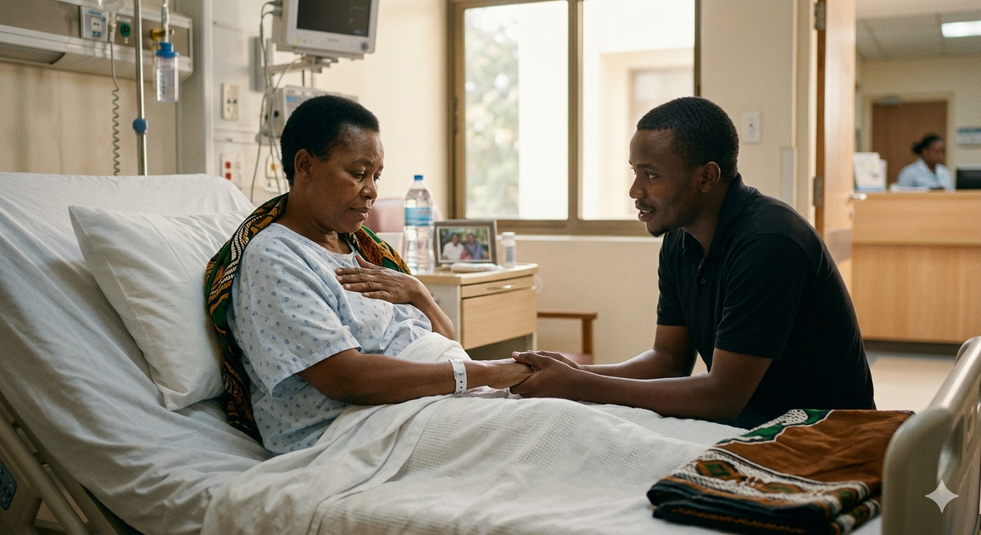 Picha hii inaonyesha jinsi familia au marafiki wanavyomtembelea mgonjwa hospitalini – uwepo wao na maneno matamu huleta faraja kubwa.