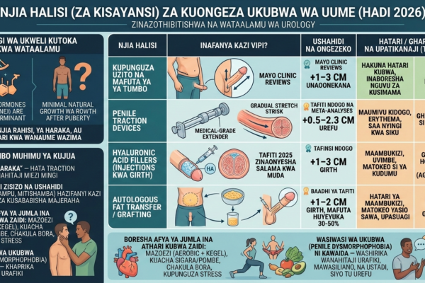 Makala hii inazungumzia njia halisi (zenye ushahidi wa kisayansi au matokeo yanayoweza kuthibitishwa) za kuongeza ukubwa wa uume (urefu au unene/girth), bila kujumuisha hadithi za kawaida au ulaghai mtandaoni kama Colgate, mdodoki, vidonge vya mitishamba, au mazoezi ya manual bila uthibitisho. Ukweli wa msingi (kulingana na tafiti na maoni ya wataalamu wa urology hadi 2026):…