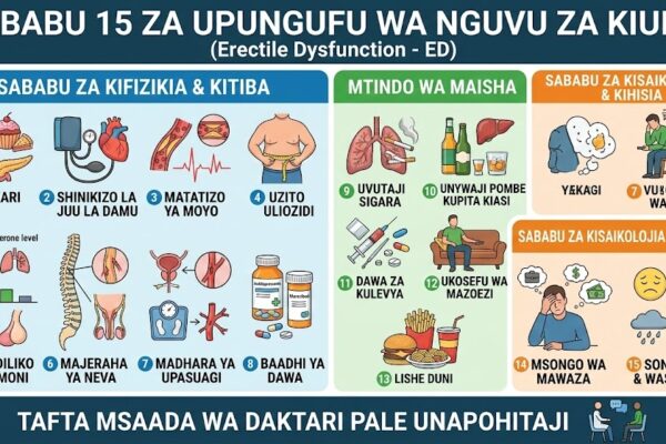 Makala hii inazungumzia sababu 15 muhimu zaidi zinazopunguza nguvu za kiume (k.m. erectile dysfunction – ED, hamu ya chini ya tendo la ndoa, au upungufu wa nguvu wakati wa tendo). Sababu hizi zinatokana na tafiti za kimatibabu (kama Mayo Clinic, Cleveland Clinic, na vyanzo vya urology hadi 2026) na zinaonekana sana Tanzania na Afrika Mashariki….